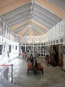 El vestíbulo, que está situado tras el pórtico de entrada al pie de la torre-minarete, tiene 12 m², planta hexagonal y actúa de distribuidor entre las tres plantas. El pavimento está compuesto por losas de mármol de forma circular mientras que el techo presenta un artesonado de madera con una franja de cinco vigas en el centro y dos grupos de siete vigas que recorren transversalmente la estancia. Esta sala tiene una vidriera con cenefas de formas geométricas y motivos ornamentales vegetales.[32]
