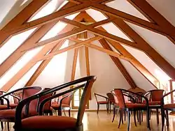 En la planta superior se encuentra el desván, dividido en dos por el salón principal ya que su altura llega hasta el techo del edificio, con acceso por dos escaleras de caracol. Tiene una superficie total de 140 m², con cubierta a dos aguas con una estructura de vigas de madera con diversos ángulos de abertura, más cerrados cuanto más cerca están del centro de la crujía. El desván cumplía también el objetivo de regulador térmico, aislando la planta noble de las temperaturas exteriores. En este espacio se hallaban las habitaciones del servicio y las dos alas estaban conectadas por un corredor exterior, paralelo a la cubierta del invernadero. Una de las habitaciones cuenta con una terraza semicircular que está sobre la galería de la sala de juegos. También hay un acceso a la terraza inferior de la torre-minarete.[39]