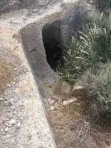 Entre los restos de construcciones aparecidos se encuentran restos de un edificio levantado con sillares de arenisca con un entablamento de relieves formando un motivo clásico. Igualmente, se encuentra una cisterna o cavidad excavada en la roca con puerta de acceso a una sala subterránea, silos excavados, pozos circulares para recogida de agua y restos de un doble amurallamiento al sur.