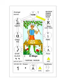 El Mago o El Malabarista es una carta del Tarot relacionado con las leyendas del Thot Theuti del panteón egipcio, con Hermes del panteón griego y con Mercurio del panteón romano.[1] Es el arcano número 1, según el Tarot, se asocia con el pluricosmos, con la fractura de la superfuerza inicial. En el contexto del juego de cartas, el Mago es la carta de triunfo de menor número, también conocida como atouts y honours. En el contexto de lo oculto, las cartas de triunfo se recontextualizan como los Arcanos Mayores y se les otorga un significado esotérico complejo. El Mago en tal contexto se interpreta como la primera carta numerada y la segunda total de los Arcanos Mayores, sucediendo al Loco, que no está numerado o bien se ve marcado con un 0. El Mago como objeto de estudio oculto se interpreta como un símbolo de poder, potencial y unificación de los mundos físico y espiritual.[2]