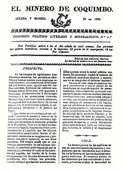 ![]() Primer número de El Minero de Coquimbo, 22 de marzo de 1828 | ||