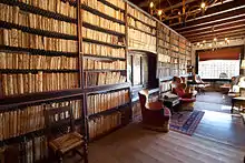 Los ejemplares de la biblioteca, con más de mil volúmenes, muchos de ellos encuadernados en pergamino, proceden del convento franciscano de Sant Domènec y originariamente del Monasterio de Santa Maria de Bellpuig de les Avellanes; la mayoría son libros de iglesia, vidas de santos y sermones, que se salvaron de ser quemados durante la Guerra Civil porque alguien tapió la entrada de la biblioteca del convento y así se evitó que fuera arrasada.