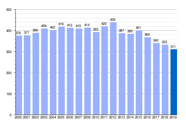 Gráfica de evolución demográfica de El Puente (Zamora)[15] entre 2000 y 2019 |