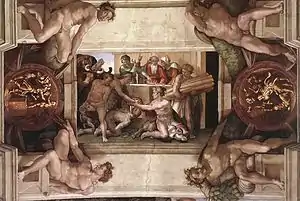 Como otras escenas centrales de la bóveda de la Capilla Sixtina, el recuadro está flanqueado por dos medallones (que, en monocromía que simula bronce, representan la Destrucción de Baal y la Muerte de Urías) y rodeado en sus cuatro esquinas por cuatro ignudi (figuras de jóvenes desnudos).[2]