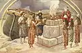 Un hombre, a la derecha, lleva en sus brazos una gran brazada de leña. A sus pies, un hombre desnudo está sentado a horcajadas sobre un carnero degollado, y se vuelve hacia su derecha para entregar las vísceras a otro para que las queme. Un segundo hombre desnudo se encuentra arrodillado y agachado para poder asomarse a un orificio delantero del altar desde el que se ve el interior del fogón.
