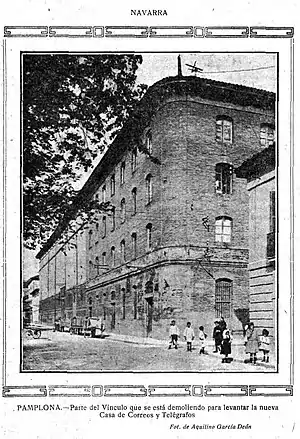 Como se inició la idea de trasladar el Vínculo a otro lugar, en las afueras de la ciudad, en 1917 el Ayuntamiento ofreció al Estado parte del solar del actual edificio, para la construcción de una casa de Correos y Telégrafos, oferta que fue aceptada por real orden del Ministerio de la Gobernación, de fecha 29 de agosto de 1917, aunque adquirieron 350 m² por 68.000 pesetas. La escritura de compra-venta, finalmente, se firma el 30 de abril de 1918 por 850 m². El alcalde firmante era Francisco Javier Arraiza y por la parte del Estado firmaba el gobernador Emilio Díaz-Moreu.