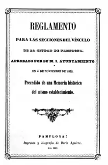 - Reglamento para las secciones del Vínculo de la ciudad de Pamplona, aprobado por su M.I. Ayuntamiento, en 4 de noviembre de 1862, precedido de una memoria histórica del mismo establecimiento. Biblioteca Digital de Navarra. Archivado desde el original el 10 de diciembre de 2014. Consultado el 11 de octubre de 2020..