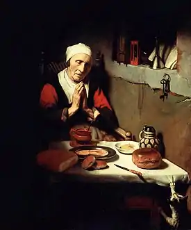 Uno de los mejores discípulos de Rembrandt, aquí Maes muestra la influencia del maestro en el cuidado en los detalles, la gama cromática cálida y el magnífico claroscuro,[1] con una luz en diagonal que cae sobre la mesa y la anciana devota, que reza en silencio con los ojos cerrados y las manos unidas en oración dando gracias por los alimentos que va a tomar. La escena en una estancia humilde pero cuidada, es muy similar a Anciana dormitando del mismo año, con algunos elementos que se repiten, como las llaves o la jarra de cerveza.