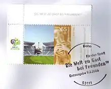 El Deutsche Post AG (servicio postal alemán) emitió el 9 de febrero de 2006 una serie de estampillas conmemorativas del torneo. Aunque el lema del torneo no aparece directamente en los sellos, los timbres sí incluían la frase Die Welt zu Gast bei Freunden™