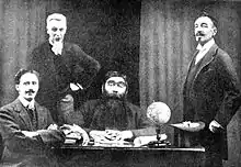 - Profesor Challenger – zoólogo.Frontispicio de la edición original de 1912, donde se muestra a los protagonistas del libro, de izquierda a derecha: E. D. Malone (del Daily Gazette); Profesor Summerlee; Profesor G. E. Challenger, y Lord John Roxton.