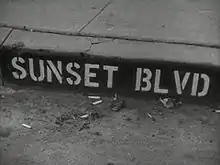 La película comienza con el plano de una acera. La cámara se mueve hasta dejar ver que en el bordillo pone "Sunset Blvd." Comienza a moverse, en un ángulo picado, sobre el pavimento de Sunset Boulevard, con los títulos de crédito sobreimpresionados. Cuando los títulos de crédito han cesado de aparecer, la cámara se mueve hasta adoptar una angulación normal: aparece una comitiva de motocicletas y coches de la policía. Una voz en off explica que se ha cometido un asesinato en una de las grandes mansiones del bloque 10.000. Mientras la voz continúa hablando, se muestra la llegada de policías y periodistas a la mansión. En la piscina se encuentra el cadáver de un joven. La voz en off explica que es un simple guionista, que "siempre quiso una piscina. Bueno, al final consiguió una. Solo que el precio resultó ser un poco alto".[3] Hay un fundido y la voz, que es la del propio muerto, empieza a explicar cómo ocurrió todo, en un flashback que se extenderá por la mayor parte de la película. La acción comienza seis meses atrás. La cámara entra por la ventana en el apartamento en el que Joe Gillis, un guionista en horas bajas -el futuro cadáver en la piscina- se encuentra escribiendo a máquina, vestido solo con un albornoz. Es interrumpido por dos cobradores que traen una orden judicial para llevarse su coche, un Plymouth convertible con matrícula de California 40 R 116, por impago. Gillis se excusa diciendo que lo ha dejado a un amigo para ir a Palm Springs. Los cobradores anuncian que regresarán por el coche al día siguiente al mediodía, y se marchan.
