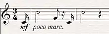 Una marcha grotesca, que llega a puntos culminantes, refuerza la ironía del momento. Es el único momento de la obra en el que no percibimos melodías reconocibles, sino más bien una masa sonora rítmica y con un gran nivel de disonancia debido a la superposición de diferentes modos. Cuando finaliza la marcha, vuelven a aparecer los acordes del amor y el motivo del ánimo, pero esta vez en tempo lento e intervalos descendentes, representando el dolor del príncipe. Con el consuelo del hada, los árboles y las flores comienzan a bailar una danza lenta y pesadumbrosa. Llega de nuevo el príncipe de madera con su característica marcha.