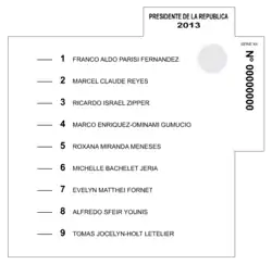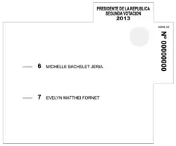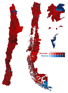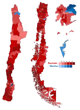 La elección presidencial fue disputada por nueve candidatos,[6] una cifra inédita en la historia electoral de Chile.[7] En la primera vuelta, Michelle Bachelet de la Nueva Mayoría obtuvo el 46,7 % de los votos válidamente emitidos y se enfrentó en segunda vuelta a la candidata de la Alianza, Evelyn Matthei, quien llegó al 25,03 %.[8] En el balotaje entre ambas, Bachelet alcanzó el 62,16 %, mientras Matthei logró el 37,83 %,[9] con una participación del 41,98 % de los electores. Además fue la primera vez que los dos candidatos más votados y que deben enfrentarse en balotaje son dos mujeres. Con estos resultados, Bachelet se convirtió en la primera mujer reelecta en la historia de Chile.
