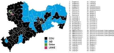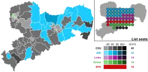Alternativa para Alemania (AfD) recibió con un 27,5% y un aumento de casi 18 puntos el resultado electoral más alto de su historia en cualquier tipo de proceso electoral llevado a cabo en Alemania, mientras que la Unión Demócrata Cristiana (CDU), Die Linke y el Partido Socialdemócrata (SPD) cayeron a mínimos históricos en Sajonia. Alianza 90/Los Verdes mejoró notablemente sus resultados y obtuvo su mejor porcentaje en la historia sajona. Pese a que las encuestas pronosticaban que obtendría representación, el Partido Democrático Libre (FDP) quedó fuera del Parlamento.