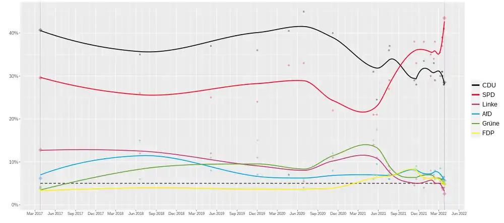 En enero de 2022, los administradores del partido retiraron la lista estatal de Alternativa para Alemania poco antes de que venciera el plazo para la presentación de candidatos. Dos miembros del ejecutivo estatal del partido cambiaron arbitrariamente a los fideicomisarios, quienes luego retiraron la lista. El presidente estatal, Christian Wirth, alegó que los cuatro miembros involucrados no apoyaron al candidato principal propuesto, Kai Melling. El partido todavía compite en los tres distritos electorales regionales, que en conjunto aportan 41 de los 51 miembros del Parlamento. Sin embargo, debido a la falta de una lista estatal, AfD no tiene un candidato principal.[19]