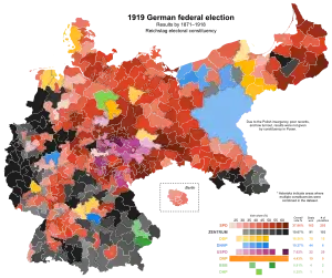 En general, los partidos contrarios a la república tuvieron un mal desempeño. Las fuerzas políticas que abogaban por una reorganización política, por otro lado, tenían a la mayoría de los votantes detrás de ellos.[13] En su núcleo, también se había demostrado que el sistema de partidos al comienzo de la república era básicamente el mismo que el del imperio. Los campos políticos han cambiado parcialmente los nombres de los partidos, pero se han mantenido como tales. Sin embargo, el sistema de partidos también se había diferenciado, por ejemplo, por la separación del USPD y el KPD en el campo socialista, o el BVP en el campo católico. Cabe destacar que muchos partidos derechistas se autodenominaron Partido Popular. El término conservador y liberal desapareció de los nombres de los partidos.[14]