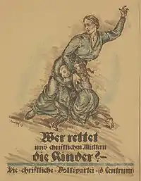 Dentro del Partido de Centro (Zentrum) católico, había un ala conservadora que rechazaba de plano la revolución. Sin embargo, tenía también un ala centroizquierdista, principalmente representada por Matthias Erzberger, que defendía la democracia liberal y el sistema republicano. El partido también discutió internamente la cuestión de si debían seguir siendo un partido católico o transformarse en un partido cristiano, no denominacional. En última instancia, se mantuvo en el statu quo de un partido católico. Una indicación de esta discusión es que el partido fue oficialmente llamado el Partido Popular Cristiano (CVP) en esta elección. Desde un punto de vista social, el partido representó a grandes partes de la Alemania católica, desde los trabajadores, la clase media y la antigua nobleza. El clero también jugó un papel importante. El partido hizo campaña cerrándose al exterior y centrándose simplemente en criticar a los socialdemócratas, considerando que realizaban acciones antieclesiásticas y buscaban una Kulturkampf (Lucha Cultural). Las políticas del Ministro de Cultura, el prusiano Adolf Hoffmann jugaron un papel importante como el epicentro de las críticas del centrismo.[6]