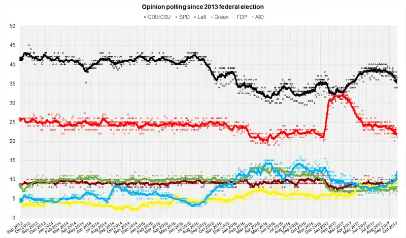 La vicepresidenta del SPD, Manuela Schwesig, y el presidente del grupo parlamentario socialdemócrata Thomas Oppermann confirmaron que el SPD pasaría a la oposición,[29] después de los resultados electorales insatisfactorios. Se barajó la posibilidad de una coalición Jamaica (negro-amarillo-verde) con la CDU/CSU, el FDP y los Verdes, que permitiría a la canciller Merkel continuar en el cargo.[30][31] Las negociaciones comenzaron oficialmente el 18 de octubre,[32][33] pero en los días finales de las conversaciones preliminares, las cuatro partes aún no habían llegado a un acuerdo sobre migración y cuestiones climáticas.[34] Las conversaciones preliminares colapsaron el 20 de noviembre después de que el FDP se retirara, argumentando que las conversaciones no habían producido una visión o confianza común.[35]