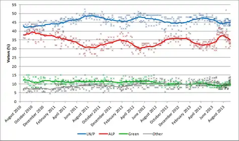 A través de finales de febrero de 2013, Investigadora Roy Morgan lanzó encuestas independientes realizadas por las entrevistas cara a cara y las encuestas telefónicas. El Electoral cara a cara se llevó a cabo cada fin de semana, aunque los datos publicados eran por lo general un promedio de votación de dos semanas. Encuestas telefónicas se llevaron a cabo de forma esporádica. Desde finales de febrero de 2013, Morgan ha lanzado una encuesta "multimodo", que consta de cara a cara, en línea, y de votación SMS.[32]
