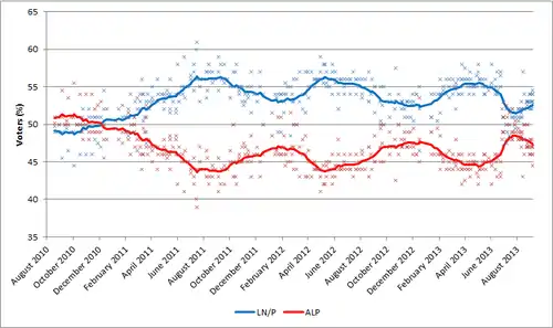 Todas las empresas informan de dos bandas preferidas al voto, estimaciones calculadas de acuerdo con el flujo de las preferencias en la última elección. Roy Morgan informa, además, estimaciones preferidas bipartidistas calculados según los encuestados informó preferencias (que por lo general se presenta como el número de la línea central en publicaciones Roy Morgan). Para garantizar la comparabilidad entre los resultados reportados por diferentes empresas, los cuadros y gráficos siguientes estimaciones informe voto sólo dos fabricantes preferido calculan de acuerdo con el primer método.