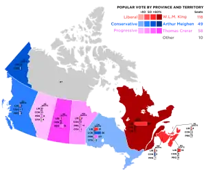El Parlamento se dividió en tres aspectos por estas elecciones. Los liberales de King ganaron un gobierno mayoritario con sólo un asiento, pero ganaron todo Quebec, gran parte de las provincias marítimas y buena parte de Ontario.
