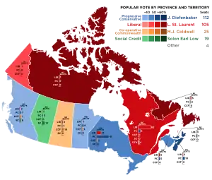 Abandonando su estrategia habitual de intentar hacer grandes avances en el Quebec dominado por los liberales, los conservadores se centraron en ganar escaños en las otras provincias. Tuvieron éxito; aunque obtuvieron pocos escaños en Quebec, obtuvieron 112 escaños en total frente a los 105 de los liberales. Con los escaños restantes ganados por otros partidos, el partido PC solo tenía una pluralidad en la Cámara de los Comunes, pero el margen fue suficiente para hacer que John Diefenbaker el primer primer ministro conservador de Canadá desde Richard Bennett en 1935.[9][10]
