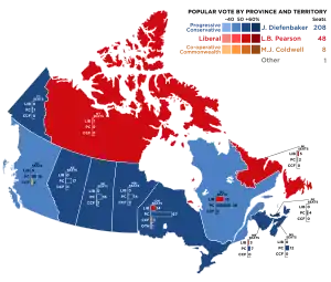 - Un cambio radical en Quebec: Quebec había sido en gran parte liberal desde la crisis del servicio militar obligatorio de 1917, pero tras la dimisión del ex primer ministro Louis St. Laurent, la provincia no tenía un hijo favorito, como lo había hecho desde 1948, y sus votantes estaban abiertos a nuevas opciones. Buscando una mayor voz en Ottawa, la Union Nationale del primer ministro de Quebec, Maurice Duplessis, utilizó su maquinaria de partido para aliarse con los conservadores, lo que permitió a los conservadores progresistas de Diefenbaker ganar dos tercios de los escaños en lo que había sido un bastión liberal durante una generación. Si bien los liberales terminaron solo cuatro puntos porcentuales detrás de los conservadores en Quebec, gran parte de su voto se desperdició al acumular grandes mayorías en sus asientos tradicionales más seguros. Sin embargo, los 25 escaños que obtuvieron los liberales en Quebec representaron más de la mitad de su grupo diezmado, y sobre una base proporcional fue su mejor desempeño después de Terranova.