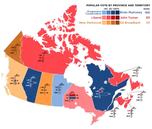 Partido Conservador Progresista | Brian Mulroney | 295 | 211 | 203 | 169 | -19.9% | 5,667,543 | 43.02% | -7.02pp | |