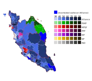 En las elecciones, la coalición conocida como Partido de la Alianza (o simplemente Alianza) emergió como vencedora. La coalición, conformada por la Organización Nacional de los Malayos Unidos (UMNO), la Asociación China de Malasia (MCA), y el Congreso Indio de Malasia (MIC), ganó 74 de 104 escaños en el Dewan Rakyat con solo el 51.8% de los votos totales. La oposición en su conjunto obtuvo 30 escaños con el 48.3% de los votos totales. Al tener una mayoría de más del 70%, la Alianza pudo formar un gobierno y sancionar la nueva constitución malaya. Cuando se anunciaron los resultados en la mañana del 20 de agosto, solo fueron distribuidos 103 escaños, ya que las elecciones en la circunscripción de Kedah Tengah se retrasaron hasta el 30 de septiembre. La Alianza ganó dicho escaño con Khir Johari como candidato.[2]