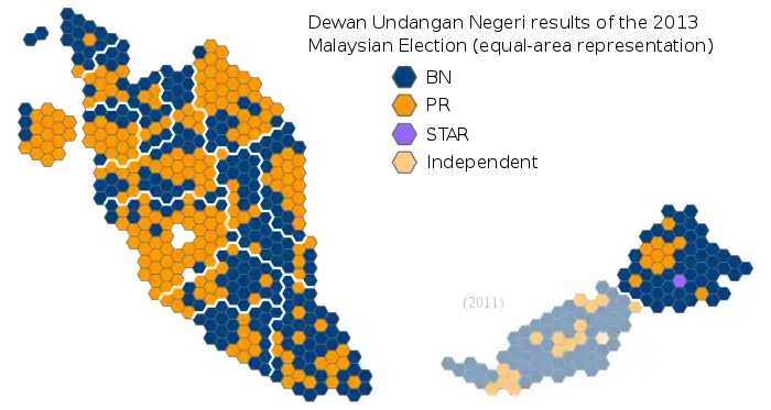 El plano estatal fue igual de controvertido, el Barisan Nasional retuvo Perlis, Terengganu, Perak (que había perdido en 2008 pero recuperado en 2009 debido a una deserción masiva y un arreglo judicial), Pahang, Negeri Sembilan, Malaca, Johor, y Sabah, gobernando entonces también Sarawak, donde las elecciones estatales habían tenido lugar en 2011; y recuperó por estrecho margen el estado de Kedah. El Pakatan Rakyat logró retener el gobierno de tres de los cuatro estados que gobernaba al llegar el momento de los comicios, Penang, Selangor, y Kelantan. En Perak, donde el Pakatan Rakyat había ganado en 2008, la oposición obtuvo casi el 55% de los votos contra el 44% del oficialismo, y aun así no logró acceder al gobierno debido a las circunscripciones desiguales. El irregular resultado, tanto a nivel federal como estatal, desató acusaciones de fraude electoral y manipulación arbitraria de circunscripciones (gerrymandering), a las cuales siguieron una serie de protestas por todo el país.[6]