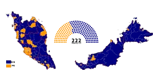 Los 222 miembros de Dewan Rakyat, la cámara dominante del Parlamento, son elegidos en distritos electorales de un miembro (circunscripciones uninominales) por escrutinio mayoritario simple. En las elecciones generales de 2013, 11.05 millones de personas votaron, lo que representaba aproximadamente el 85 por ciento de los votantes registrados en total, y era la tasa más alta que Malasia había obtenido en su historia electoral.[24]