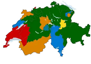 Partido Demócrata Cristiano | CVP/PDC | Centro/Centroderecha | Democracia cristiana | 300,544 | 12.3 | −2.2 | 28 | 14.0 | −3 | |
