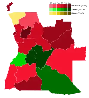 El resultado, sin embargo, marcó no solo la continuidad de la guerra por otros diez años, sino que también significó el mantenimiento del régimen represivo de José Eduardo dos Santos (que gobernaba desde la muerte de Agostinho Neto en 1979). El hasta entonces partido único de la República Popular de Angola, el Movimiento Popular de Liberación de Angola (MPLA) mantuvo su hegemonía con una amplia mayoría absoluta en el legislativo, de 129 escaños, que sin embargo, sería el resultado más estrecho que jamás lograría. Sin embargo, mientras que en el legislativo el voto al MPLA fue del 53%, en las presidenciales no se dio así, y Dos Santos, que se presentó a la reelección, estuvo a 0.43 puntos porcentuales de lograr la mayoría de 50% que necesitaba para ser elegido en primera vuelta. Jonas Savimbi, de la Unión Nacional para la Independencia Total de Angola, quedó en segundo lugar con poco más del 40%. De ese modo, Dos Santos y Savimbi debían pasar a una segunda vuelta entre ambos, destinada a celebrarse a mediados de octubre.