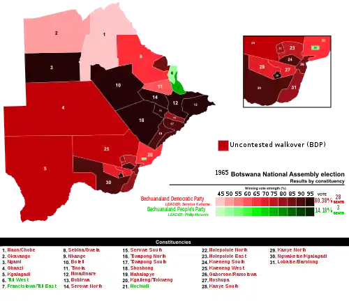 El nacionalista y moderado Partido Democrático de Bechuanalandia (BDP), encabezado por Seretse Khama, líder tribal miembro de una de las casas reales más poderosas del protectorado, obtuvo un rotundo triunfo con el 80,38% de los votos válidamente emitidos y casi la totalidad de los escaños, imponiéndose en 28 de las 31 circunscripciones del país. La oposición al BDP concurrió dividida en facciones partidarias que, si bien adherían al nacionalismo africano que Khama impulsaba, tenían posturas mucho más radicalizadas y centradas mayormente en cuestiones étnicas, lo que debilitó su accionar ante la diversa población del territorio. El Partido Popular de Bechuanalandia (BPP) obtuvo el segundo puesto con el 14,18% de los votos y triunfó en las tres circunscripciones restantes, asegurándose ser el único partido opositor al gobierno electo con presencia parlamentaria. El Partido de la Independencia de Bechuanalandia (BIP) logró el 4,61% de los votos y no obtuvo escaños. El resto de los votos fueron a parar a un postulante disidente del BPP y a un único candidato independiente en dos circunscripciones. Tres candidatos del BDP fueron elegidos sin oposición, por lo que no se realizó votación algunas en dichas circunscripciones.[1]