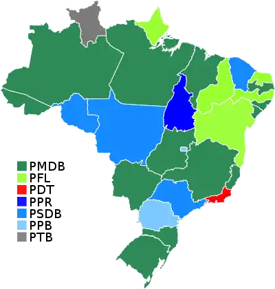 Río Grande del Norte | RN | Garibaldi Alves Filho[nota 39] | PMDB | Fernando Freire | PMDB, PPR y PSDB |
