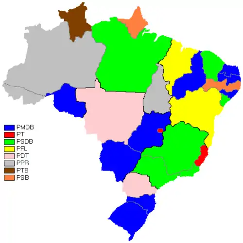 Sergipe | SE | Albano Franco[nota 39] | PSDB | José Carlos Machado | PSDB, PFL, PMDB, PPR, PTB, PPS, PL, PSC, PTdoB, PSD y PRP |