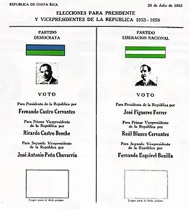 El Partido Demócrata, formación centrista y parte integral de la coalición opositora victoriosa en las elecciones de 1948, se había registrado formalmente ante el Tribunal Supremo de Elecciones el 27 de octubre de 1952, concurriendo con Fernando Castro Cervantes.[17] El partido había perdido fuerza cuando un sector de sus integrantes ("Acción Demócrata") se unió al Partido Liberación Nacional.[1] Su líder, Castro Cervantes, era un empresario ganadero que había formado parte de la oposición al calderonismo antes de la guerra de 1948, pero que con posterioridad a la derrota del régimen había roto relaciones con el gobierno revolucionario y se oponía mucho más abiertamente a la figura de Figueres.[16]