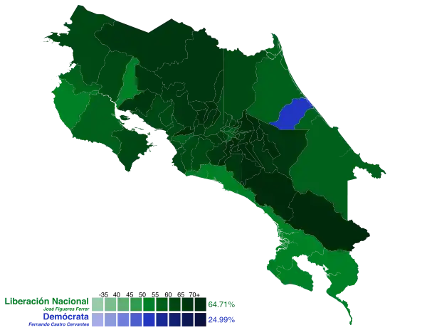 El Partido Liberación Nacional triunfó en las siete provincias de Costa Rica, fenómeno que no se volvería a repetir hasta las elecciones de 1970. Figueres triunfó también en 81 de los 82 cantones del país, superando el 70% de los votos en diecisiete de ellos.[2][3] Su mejor resultado fue en la provincia de Cartago, donde logró el 75,01% de los votos, y el desempeño más bajo en la provincia de Limón con un 54,41%, donde se encontraba Siquirres, el único cantón en el que triunfó Castro Cervantes. Siquirres se perfiló como un cantón particularmente contrario al liberacionismo, y se mantendría como el único cantón en el que el PLN jamás triunfó hasta las elecciones de 1982, volviendo a triunfar el partido allí solo en 1994, 2006 y 2010, así como en la primera vuelta de 2014. Fuera de Siquirres, Castro Cervantes solo superó el 45% de los votos en cuatro cantones: Aguirre, Golfito y Parrita, en la provincia de Puntarenas, y Cañas en la provincia de Guanacaste.[2][3]