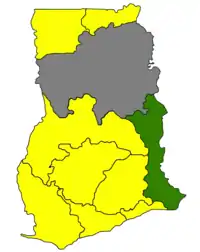 Partido | Ashanti | Brong Ahafo | Central | Oriental | Gran Acra | Norte | Alta Oriental | Volta | Alta Occidental | Total escaños | |