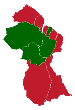 Archivo:Flag of the Essequibo Islands-West Demerara Region.png Región N.º 3 - Islas Esequibo-Demerara Occidental | 40.446 | 72.79% | 20 | 13.676 | 24.61% | 7 | 194 | 0.35% | 0 | 314 | 0.57% | 0 | 934 | 1.68% | 0 |