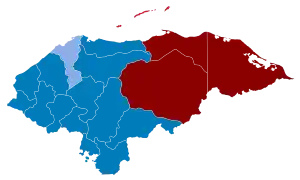 Partido Nacional![]() | Azules Unidos | Juan Orlando Hernández | 446,230 | Válidos: 982,437 Nulos: 79,924 Blancos: 82,083 Total: 1,144,444 (46.55%) |