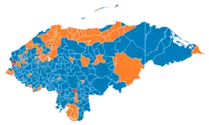 Partido Nacional![]() | Juntos por más Cambios | Juan Orlando Hernández | 1 063 807 | Válidos: 1 149 327 Nulos: 119 346 Blancos: 110 097 Total: 1 378 770 (51.56 %) |