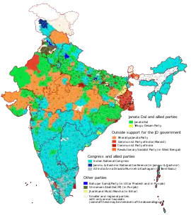 En la India se celebraron elecciones generales en 1989 para elegir a los miembros del 9º Lok Sabha.[1] El gobierno del Congreso Nacional Indio (I) bajo la presidencia de Rajiv Gandhi fue derrotado por el Frente Nacional, una alianza forjada por Janata Dal, que ganó una pluralidad de escaños. La alianza formó el gobierno con el apoyo externo del Partido Bharatiya Janata (BJP).[2] V. P. Singh prestó juramento como séptimo Primer Ministro de la India el 2 de diciembre de 1989.[3][4][5]