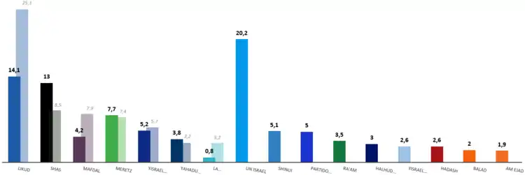2: Se presentaron en alianza con Gesher en la elección pasada. Para la variante de escaños se tomó únicamente los escaños ganados por el partido individualmente dentro de la alianza.