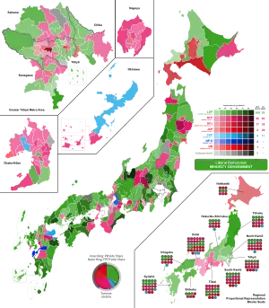 La participación de los votantes cayó por debajo del 60% por primera vez en la historia registrada (59,65%). La última elección fue la más baja de todas las elecciones anteriores, con un 67,26%. La coalición gobernante (LDP, SDP, NPH) obtuvo una mayoría de escaños en la Cámara de Representantes con 256 escaños, pero el SDP y NPH perdieron la mayoría de sus escaños por formar una coalición con LDP. Si bien la coalición de oposición (NFP, DPJ, JCP y otros) obtuvo 235 escaños, el total de votos de su circunscripción local fue mayor que la coalición gobernante, con un 53,45%.