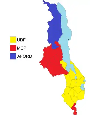 Los 177 escaños de la Asamblea Nacional de Malaui fueron disputados por ocho partidos, que presentaron hasta 600 candidatos, y trece independientes también presentaron listas. La UDF ganó 85 escaños, mientras que el MCP terminó segundo con 56 escaños. Los resultados en dos asientos, ambos ganados por MCP de Banda, fueron anulados debido a irregularidades.[1]
