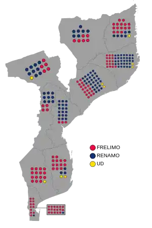 La Asamblea de la República está compuesta por 250 escaños elegidos mediante representación proporcional por listas en once distritos plurinominales (uno para cada provincia y la ciudad de Maputo). La distribución de escaños se hace mediante el método D'Hondt con un umbral electoral del 5% de los sufragios emitidos para que los partidos obtengan representación parlamentaria.[10] La distribución de escaños por provincia fue la siguiente: