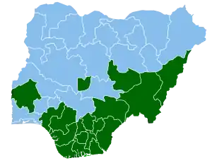 Estados ganados por Abubakar (en verde) y Buhari (en azul) | |||||||||||