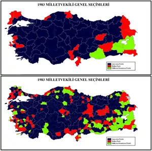 Unas elecciones generales se llevaron a cabo en Turquía el 6 de noviembre de 1983, con una participación del 92.26%.[1] Fueron realizadas durante la dictadura militar de Kenan Evren, estando ilegalizados todos los partidos políticos existentes antes del golpe militar de 1980. El Partido Republicano del Pueblo concurrió como Partido del Pueblo, y el Partido de la Justicia, como Partido de la Patria.[2] Este último obtuvo la victoria con una mayoría absoluta de 211 escaños sobre 399 (originalmente había ganado 212 de 400, pero el diputado electo fue anulado por la dictadura). El nuevo gobierno, dirigido por Turgut Özal, asumió sus funciones el 9 de noviembre. Se considera que la victoria del ANAP causó un rápido cambio en la sociedad turca y en la estructura política del país.[3]