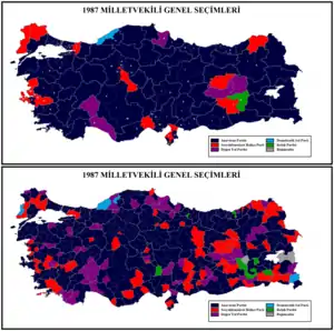 Las elecciones generales se celebraron en Turquía el 29 de noviembre de 1987. Esta elección fue importante por dos eventos; las restricciones de la Junta Militar a los antiguos políticos se levantaron para que volvieran a unirse a la escena política, mientras que el Partido de la Patria conservó su mayoría en el parlamento al perder votos pero ganar más escaños, gracias al sistema electoral del país. La participación electoral fue del 93.28%.[1]